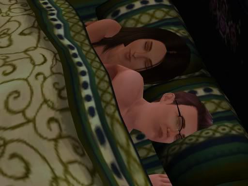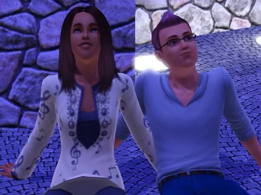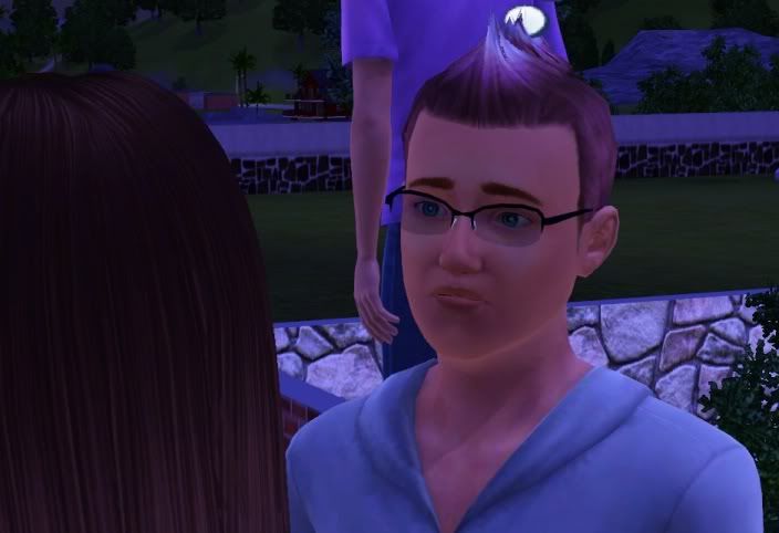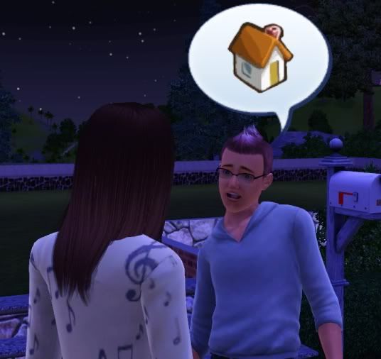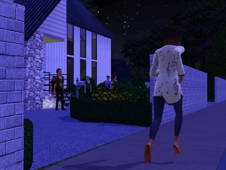 So, instead of worrying about what I may or may not have gotten myself into or getting a good nights sleep to give my employers a good impression, I decided to run over and meet my new neighbors. [and maybe to get a few simoleons from them. Hey, I'm not above asking people for money. Get what you can, right?][I arrived at night, but it seems it wasn't too late for them to be out in their yard]